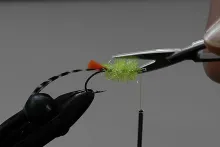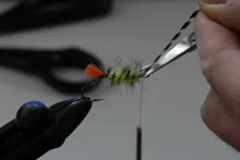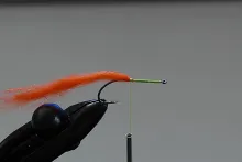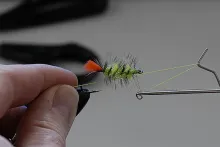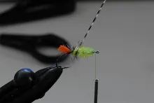After a coffee break I followed this miraculous inspiration out of nowhere and found two unbelievable ugly flies - bright green body, orange tail and a grizzly-hackle tied around the body.