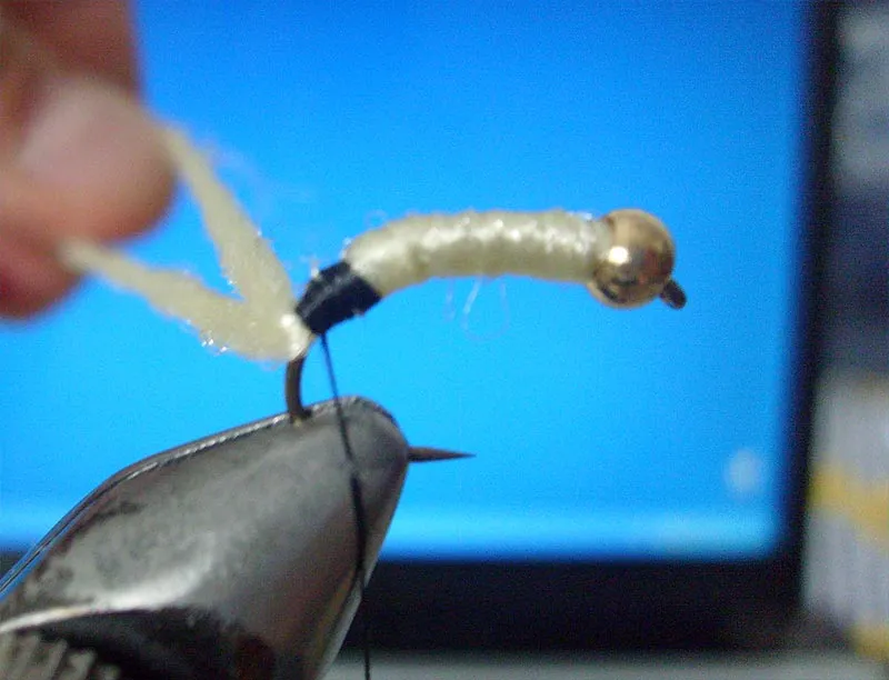 Tie the end of the yarn back on the tail of the fly thus creating a loop or make a two thread legs by splitting the Antron for a thinner body.